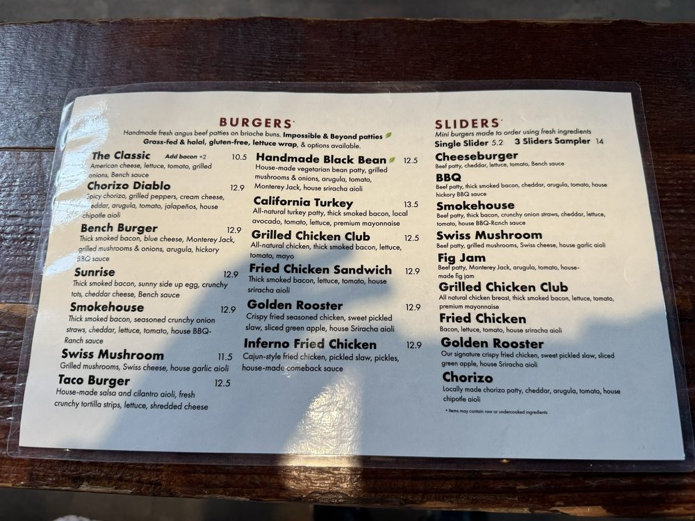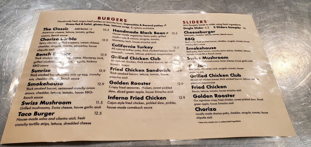 Burger Bench is a fast-casual burger spot located in downtown Escondido, offering takeout, reservations, and delivery services. They provide a range of options for different dietary preferences, including vegan and limited vegetarian choices. The restaurant is wheelchair accessible, with outdoor seating available. Customers rave about the flavorful burgers and friendly service. Standout dishes include the Golden Rooster chicken sandwich, the Sunrise burger, and the Bench Burger topped with blue cheese, bacon, and grilled mushrooms. The classic burger and truffle parmesan fries also receive high praise for their juicy patties and crispy, flavorful fries. With a diverse menu and welcoming atmosphere, Burger Bench is a must-visit for burger enthusiasts looking for a memorable dining experience.
